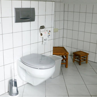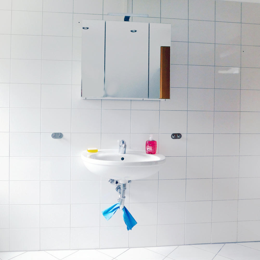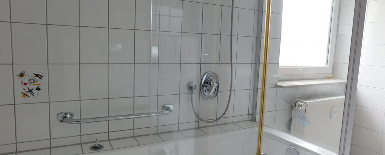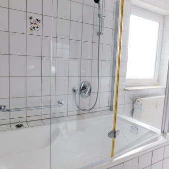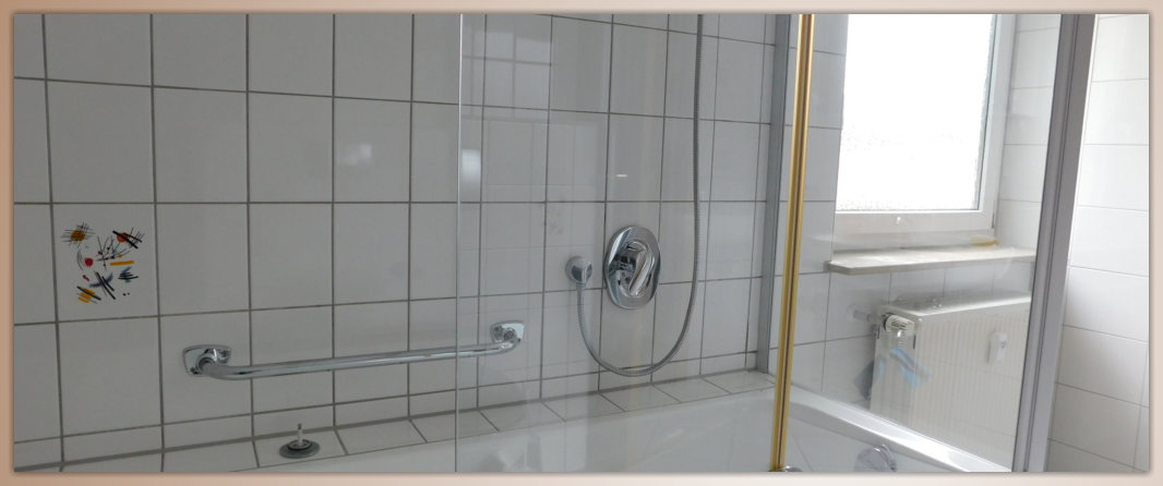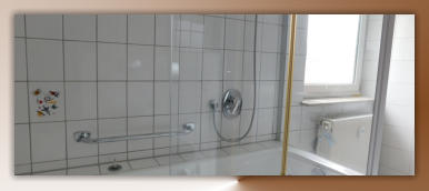 Wir bieten Raum für 4 Personen in 3 Privatzimmern bzw. einer voll ausgestatten Ferienwohnung im Dachgeschoss unseres Wohnhauses.Hier unser Bad 8 qm, sehr geräumig mit Badewanne/Duschkombination, WC, Waschbecken, Spiegelschrank und mehr