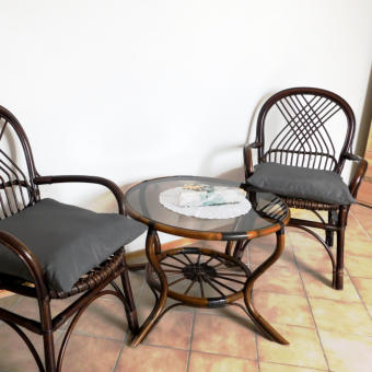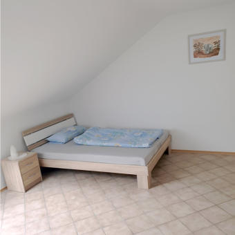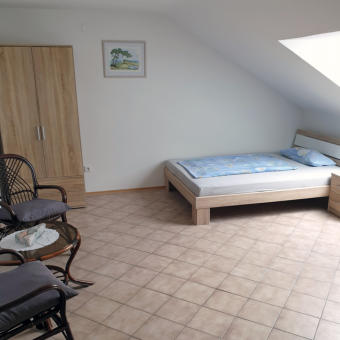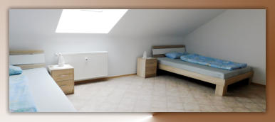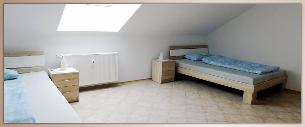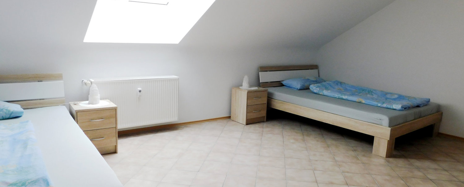 Wir bieten Raum für 4 Personen in 3 Privatzimmern bzw. einer voll ausgestatten Ferienwohnung im Dachgeschoss unseres Wohnhauses.Hier unser 19 qm großes Zweibettzimmer mit 2 getrennten Betten, Schrank Nachtkästchen und kleiner Sitzgruppe