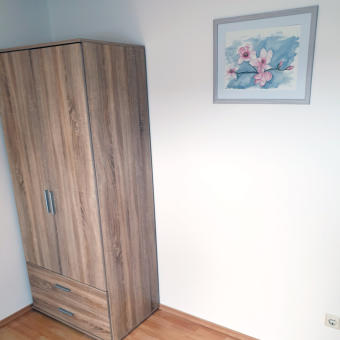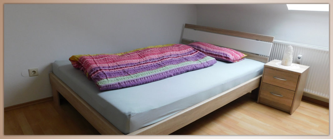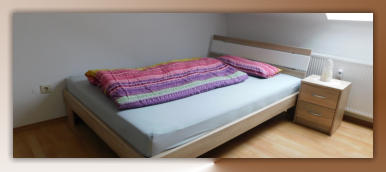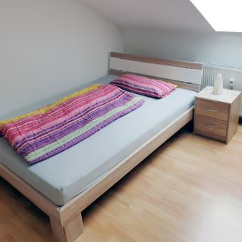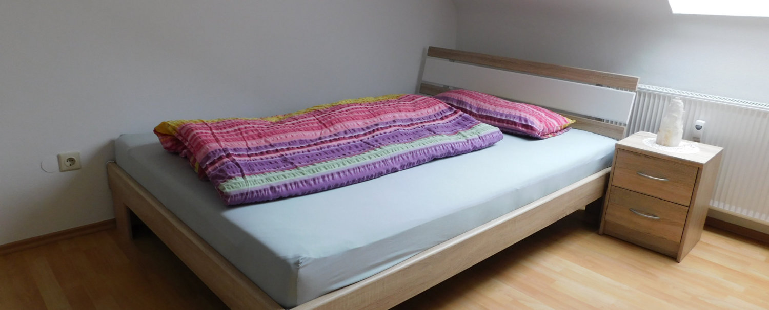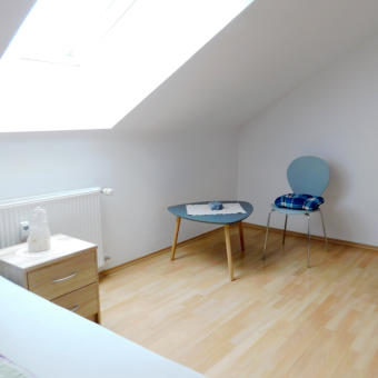 Wir bieten Raum für 4 Personen in 3 Privatzimmern bzw. einer voll ausgestatten Ferienwohnung im Dachgeschoss unseres Wohnhauses.Hier unser Südzimmer (Einzelzimmer) mit Bett, Schrank, Nachtkästchen und kleiner Sitzgruppe.